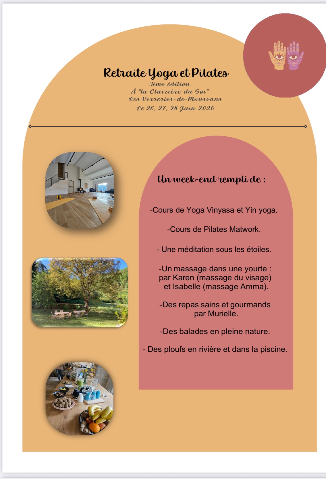 Programme de la Retraite Cours de Yoga Vinyasa et Yin Yoga, ainsi que de Pilates Matwork. Activités incluent méditation sous les étoiles, massages en yourte, repas sains, balades en…
