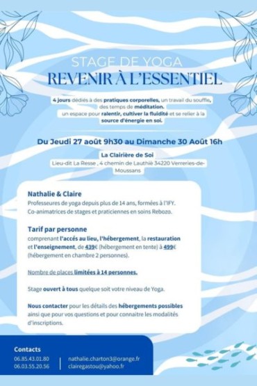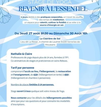 4 jours dédiés à des pratiques corporelles, un travail du souffle, des temps de méditation, un espace pour ralentir, cultiver la fluidité et se relier à la source d’énergie en soi.